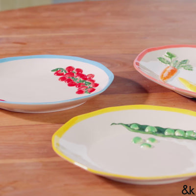 Le plateau de service Pomodoro en grès &Klevering marie un fond blanc lumineux, un contour bleu franc et des tomates cerises peintes en rouge éclatant. Le motif végétal semble délicatement posé sur la surface, apportant une touche organique et ensoleillée à cette grande assiette de présentation.