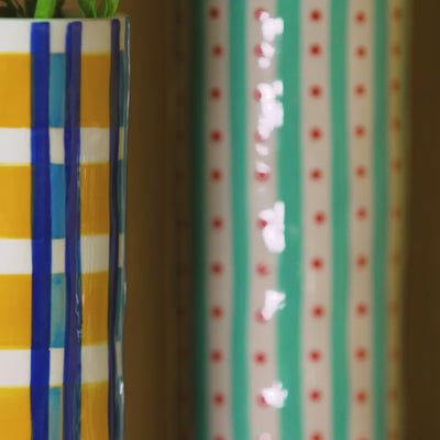 Le vase cylindrique Clash Grid &Klevering associe une base blanche lumineuse à un quadrillage vibrant : lignes horizontales roses et rayures verticales vertes se croisent pour former un motif graphique audacieux. Peint à la main, le décor présente des irrégularités volontaires qui rendent chaque pièce unique.